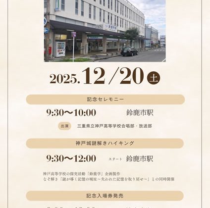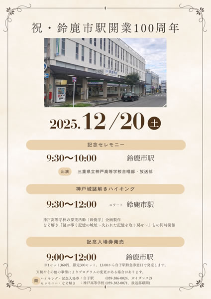 【鈴鹿学】12/20(土)、鈴鹿市駅開業100周年記念セレモニー、なぞ解き「謎が導く記憶の城趾~失われた記憶を取り戻せ~」を開催します