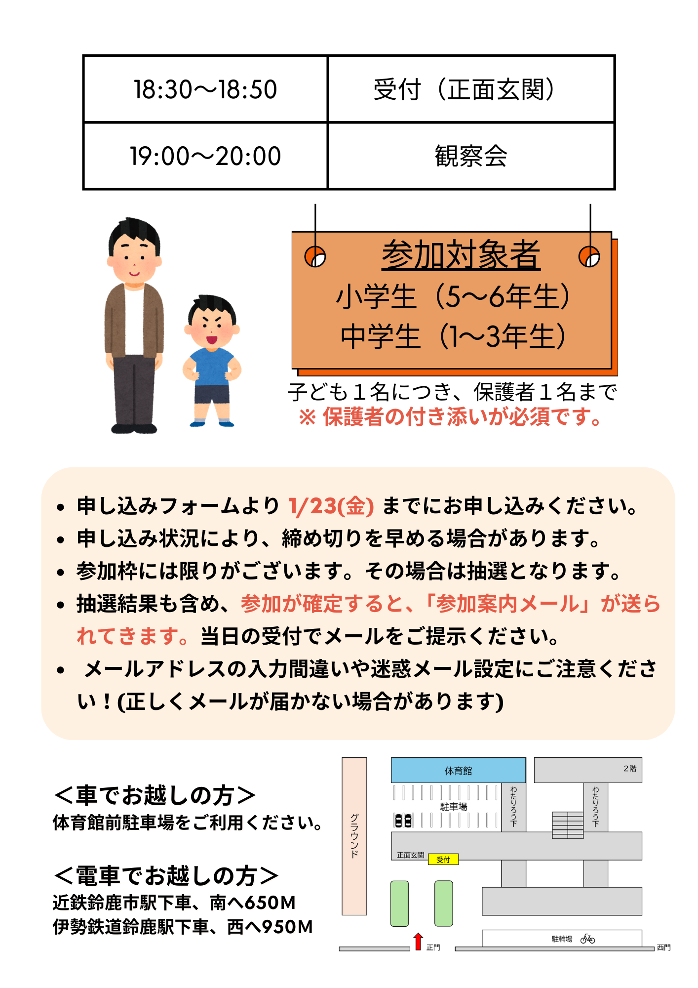 小学校5年生~6年生、中学校1年生~3年生が対象です。保護者1名の同伴が必須です。